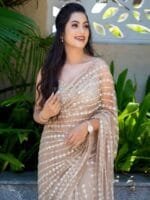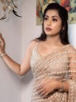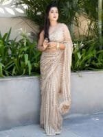 • Nude-coloured and silver-toned saree