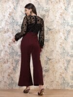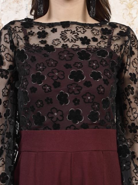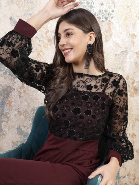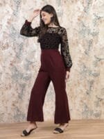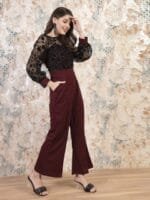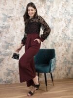 Maroon and black self design basic jumpsuit with embellished, has a round neck, long sleeves, 2 pockets