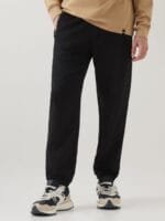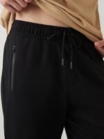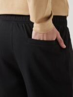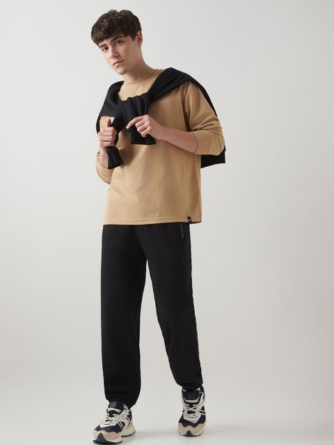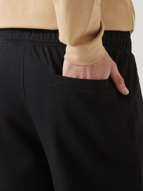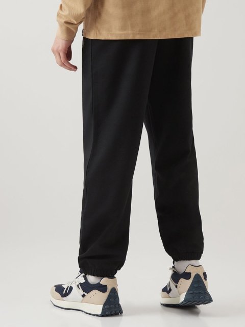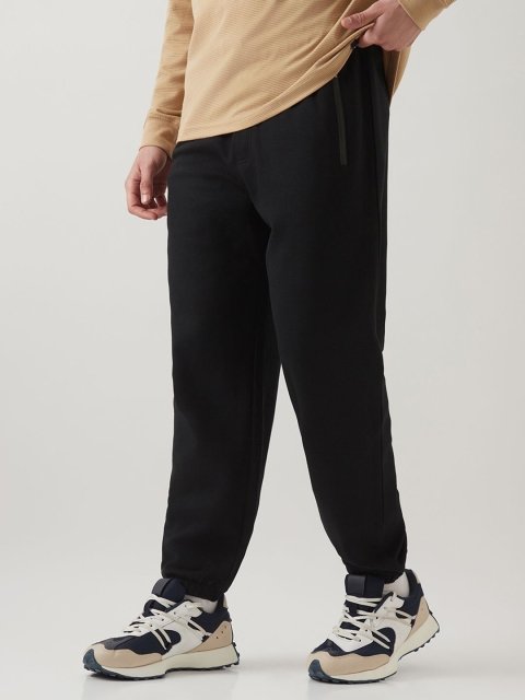 Black solid relaxed-fit mid-rise joggers, has an elasticated waistband with drawstring closure and two pockets