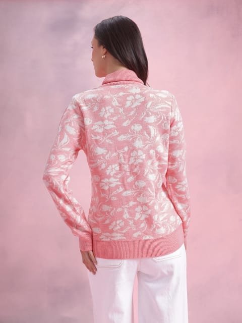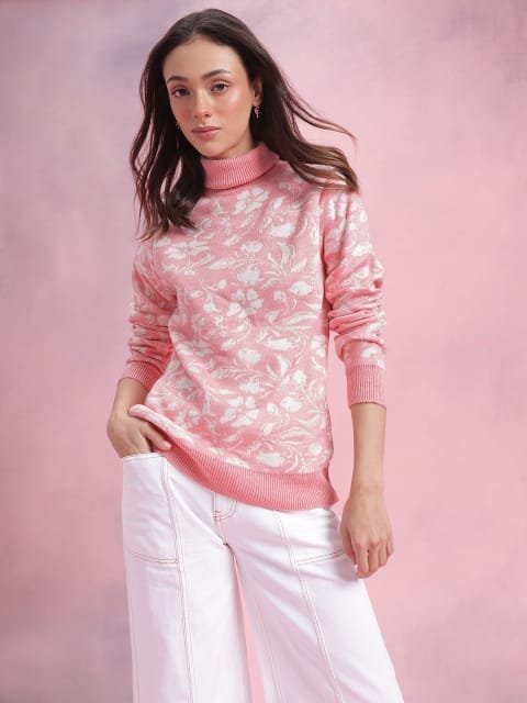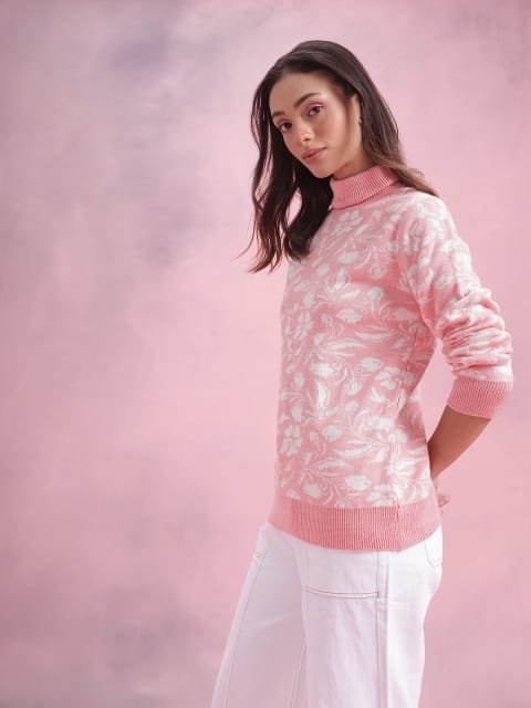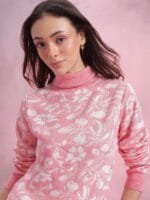 Pink self design pullover ,has a turtle neck, long sleeves, ribbed hem