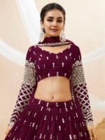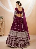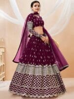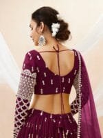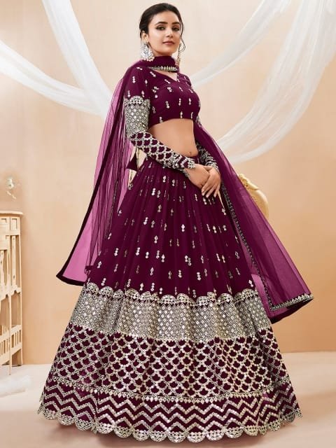 Purple and gold-toned embroidered lehenga choli with dupatta, mirror work