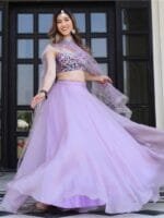 Lavender and red embroidered lehenga choli with dupatta, sequinned