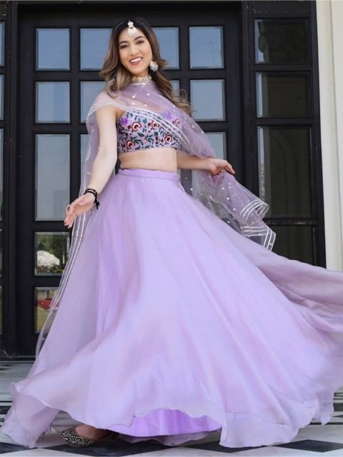Lavender and red embroidered semi-stitched lehenga, flared hem