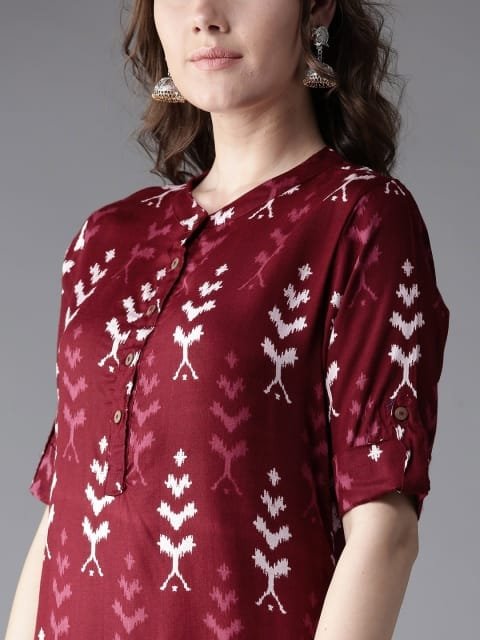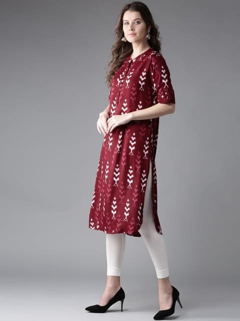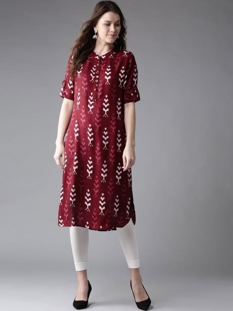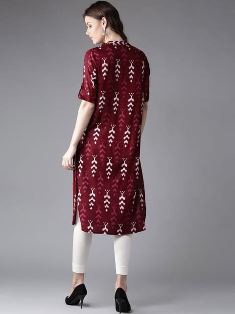 Burgundy and white printed straight kurta, has a mandarin collar, short sleeves, curved hem, side slits
