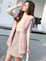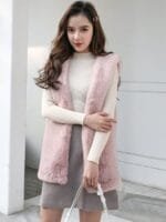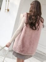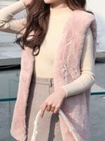 Pink solid front open overcoat, has notched lapel collar, sleeveless, a straight hem