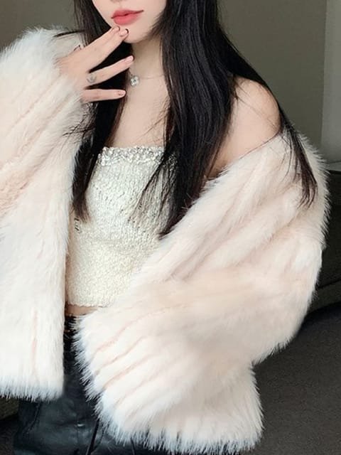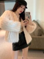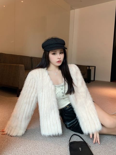 Beige striped fur over-coat, has shawl collar, long sleeves, front open and straight hem