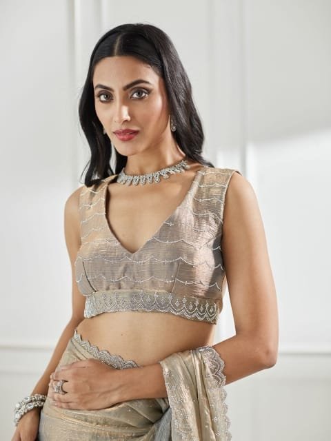 The blouse worn by the model might be for modelling purpose only. Check the image of the blouse piece to understand how the actual blouse piece looks like.