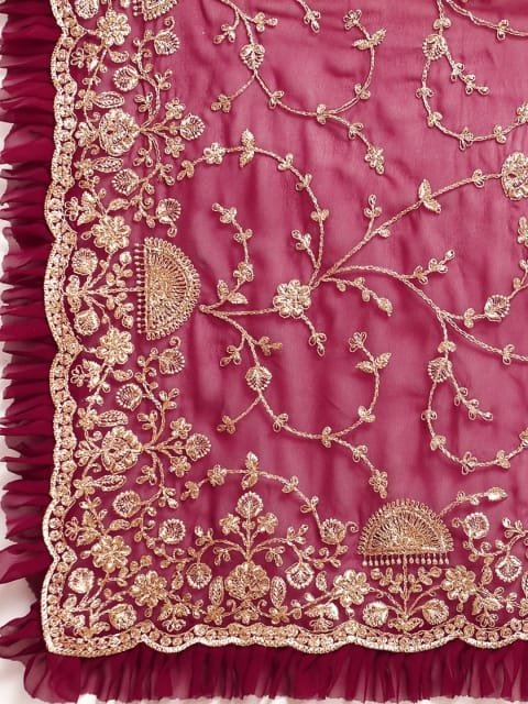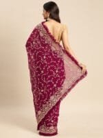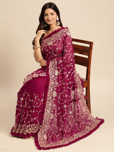 - Burgundy and gold-toned saree