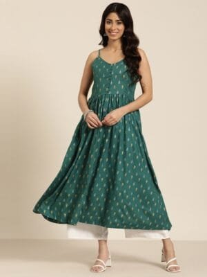 Green woven design Kurta with Trousers & dupatta :