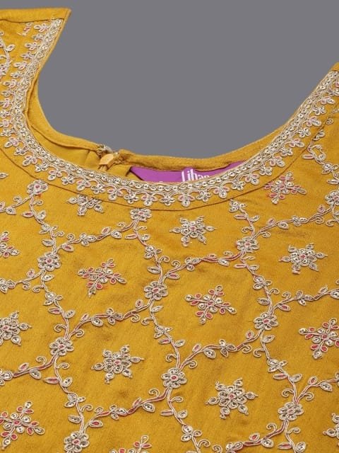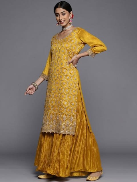 Mustard yellow and gold toned embroidered kurta with sharara and dupatta