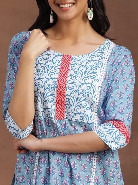 Our 3-piece blue printed cotton suit set features a straight-fit floral print kurta with a round neckline and three-quarter sleeves, straight pants with a partially elasticated waistband and roomy pockets, and a dupatta in a complementing print. Elevated with delicate fabric and lace-trim detailing, this smart style is perfect for work and beyond.