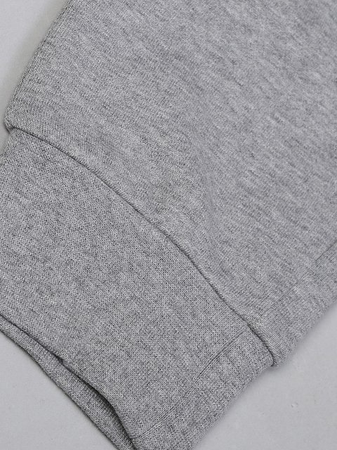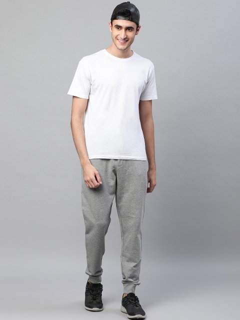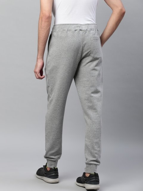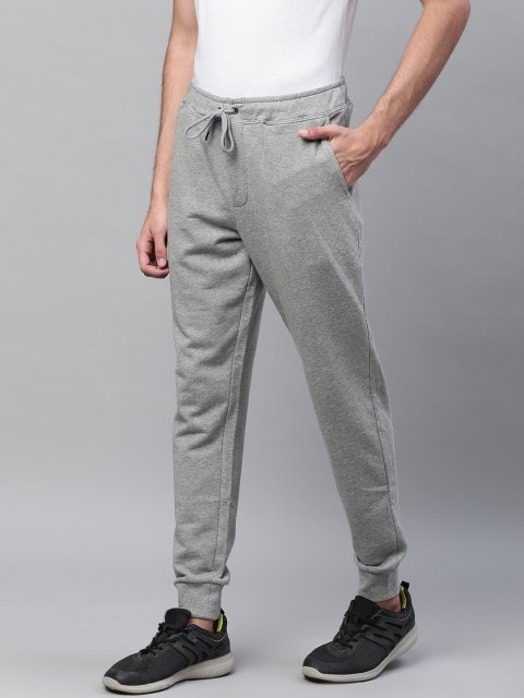 A pair of grey solid joggers, has an elasticated waistband with drawstring closure, three pockets, cuffed hem