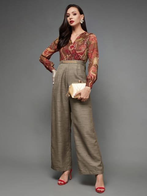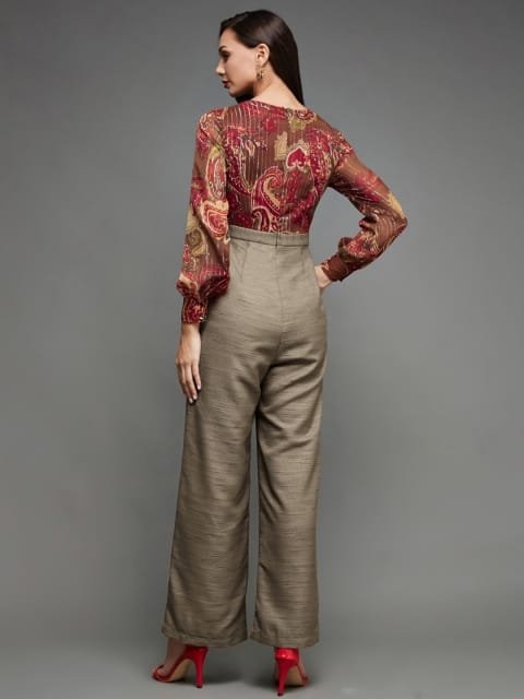 Maroon self design basic jumpsuit ,has a v-neck, long sleeves, 2 pockets