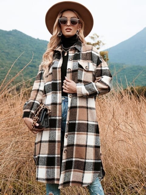 Khaki brown, black and white checked single-breasted overcoat, has a shirt collar, long sleeves, front button closure, two pockets, a straight hem