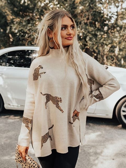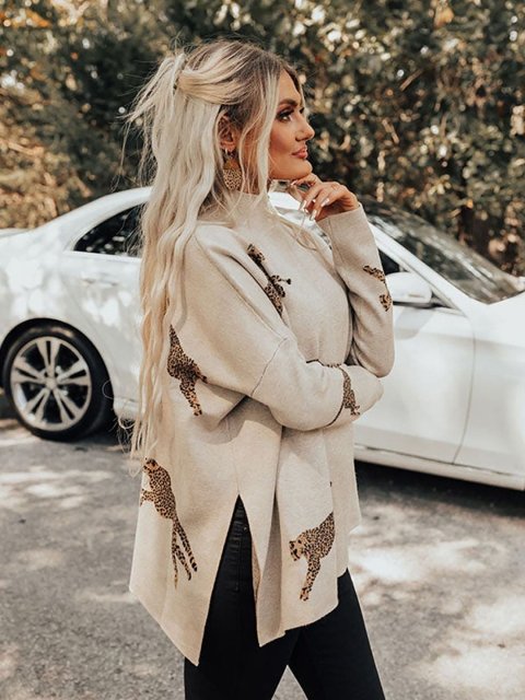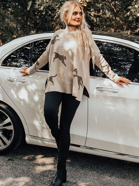 Beige printed pullover ,has a turtle neck, na pockets, long sleeves, ribbed hem