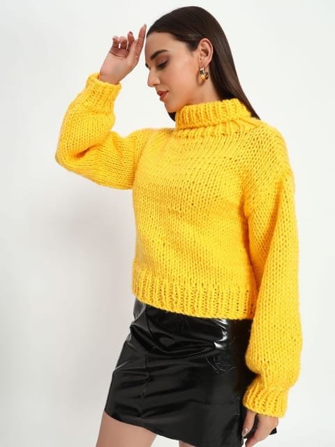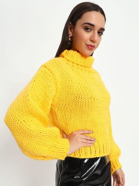 Yellow solid pullover ,has a turtle neck, na pockets, long sleeves, straight hem
