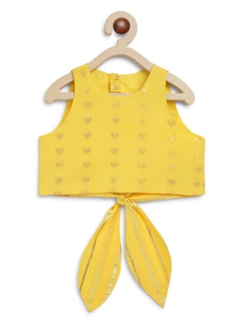 Yellow and green woven design ready to wear blouse, has a round neck, sleeveless, yellow and green woven design ready to wear lehenga, flared hem
