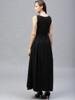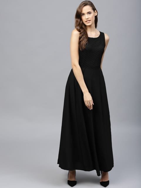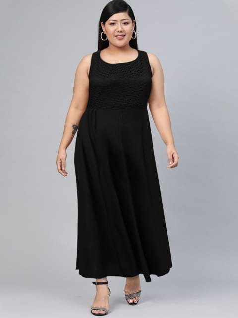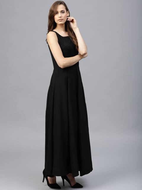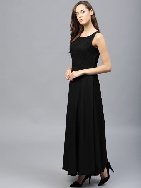 Black solid woven maxi dress with lace detail, has a round neck, sleeveless, concealed zip closure, an attached lining, flared hem