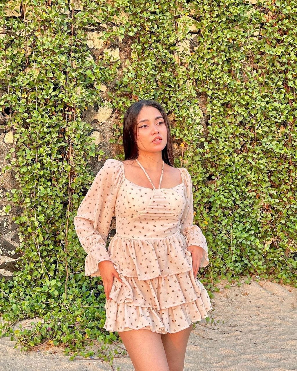 This pretty dress is made out of soft georgette fabric and is beautifully designed . It has lining on the inside and is padded too !! Perfect for summer outings 🌻